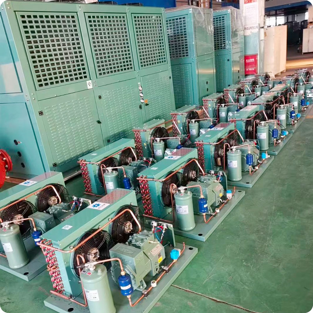 The best commercial refrigeration equipment for a fruit and vegetable storage area Our condensing units have medium temperature (-15°C~-18°C), low temperature (-18°C ~-25°C) and high temperature (0°C ~5°C). It is equipped with the original new best brand compressor, such as Danfoss, Emerson, Panasonic, with high efficiency corrosion proofing design evaporator and condenser.